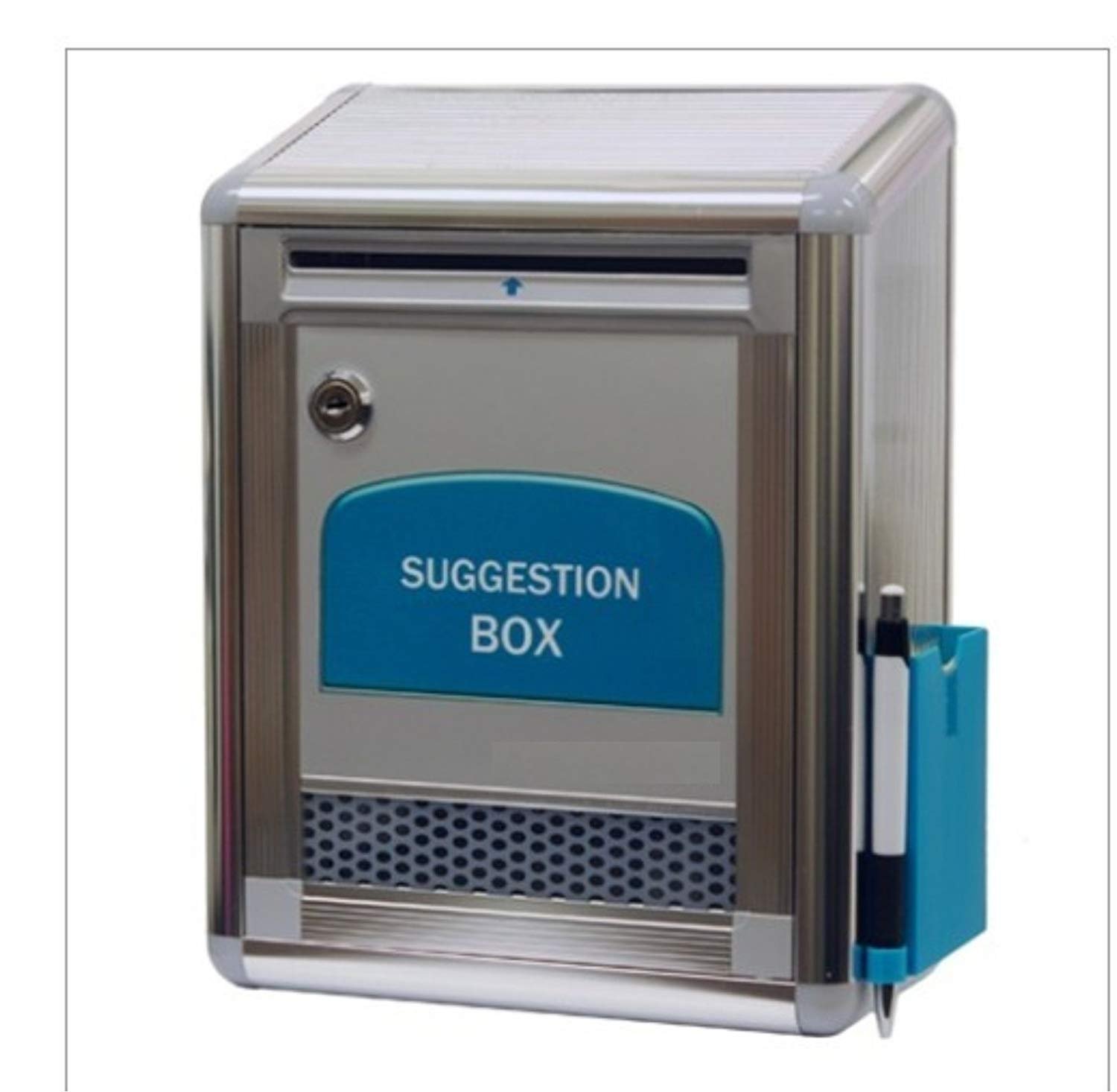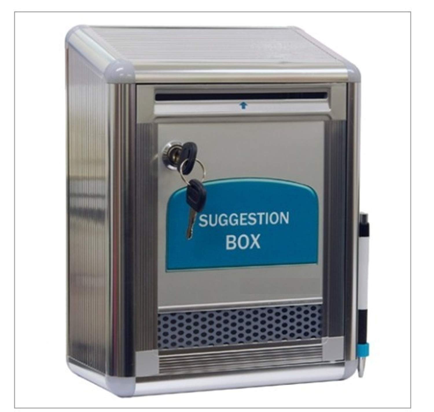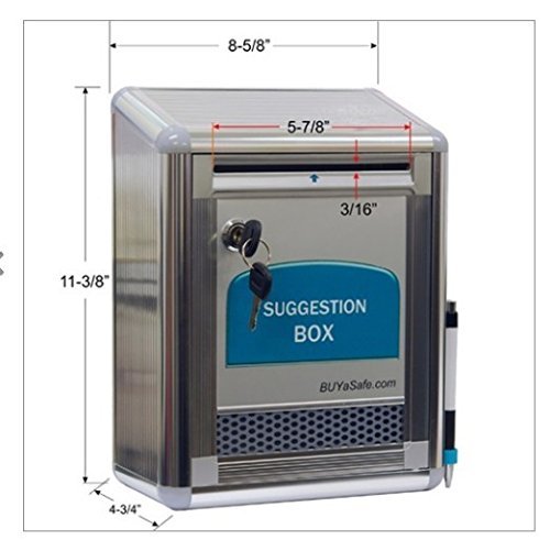 The perfect way to lock and secure suggestions, ballots, and mail. Built-in storage compartment for suggestion notes. Top slot fits envelopes and papers up to 5-1/2 inches wide. Built-in lock includes 2 keys and keeps contents confidential. Includes: Mounting screws Wall mount, can be mounted on the wall with 2 screws Includes pen.